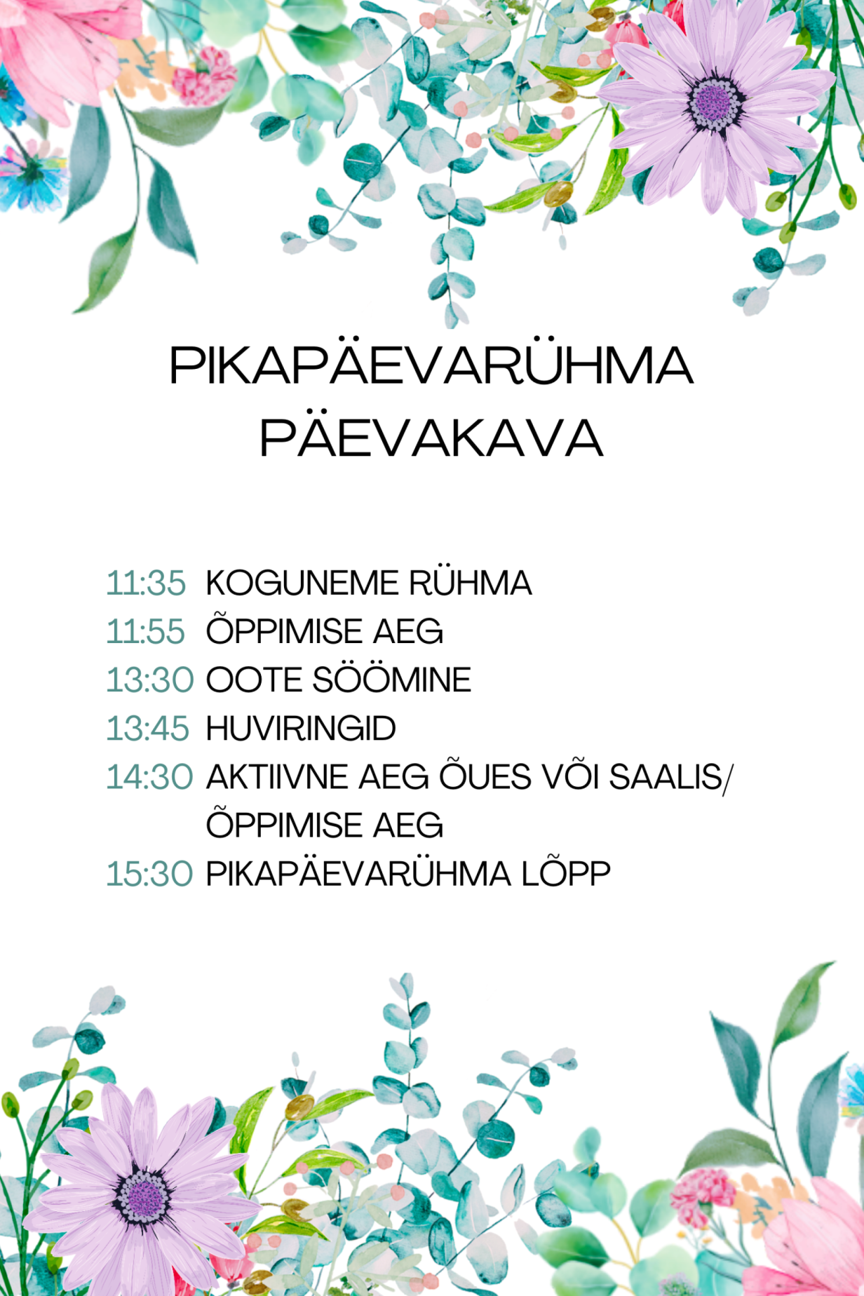 Pikapäevarühma õpetajad - Aino Kahu 53941838 (E, N ja R) ja Aime Raidmäe 56247110 (T ja K).