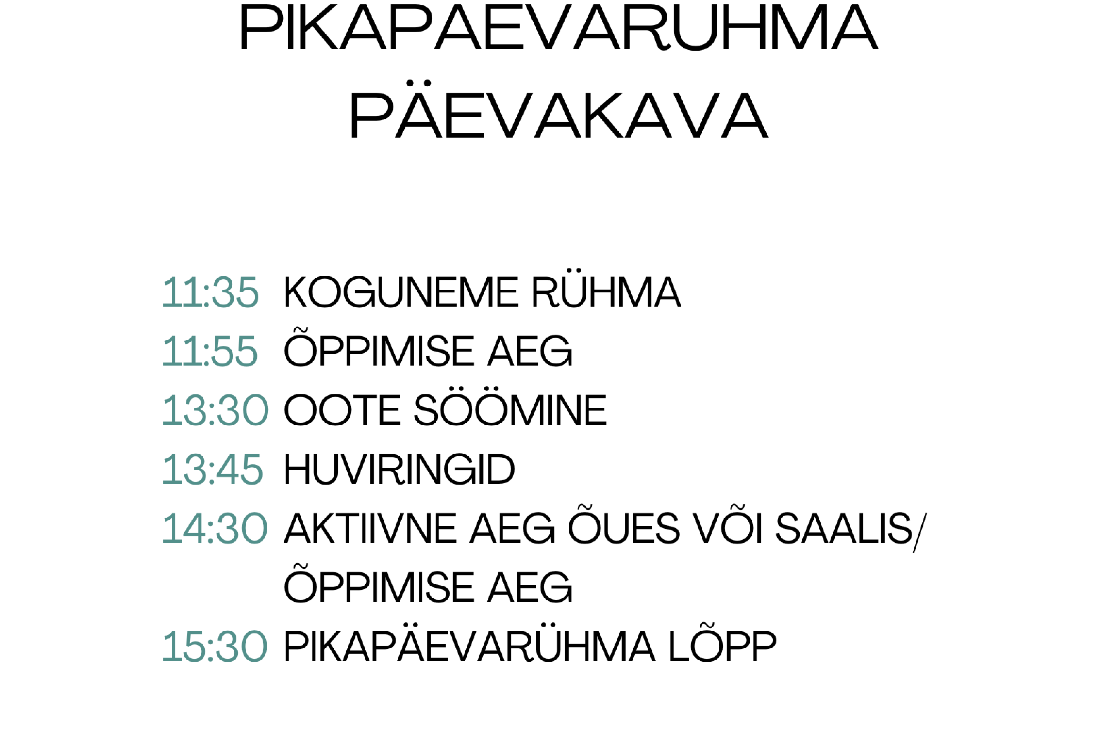 Pikapäevarühma õpetajad - Aino Kahu 53941838 (E, N ja R) ja Aime Raidmäe 56247110 (T ja K).