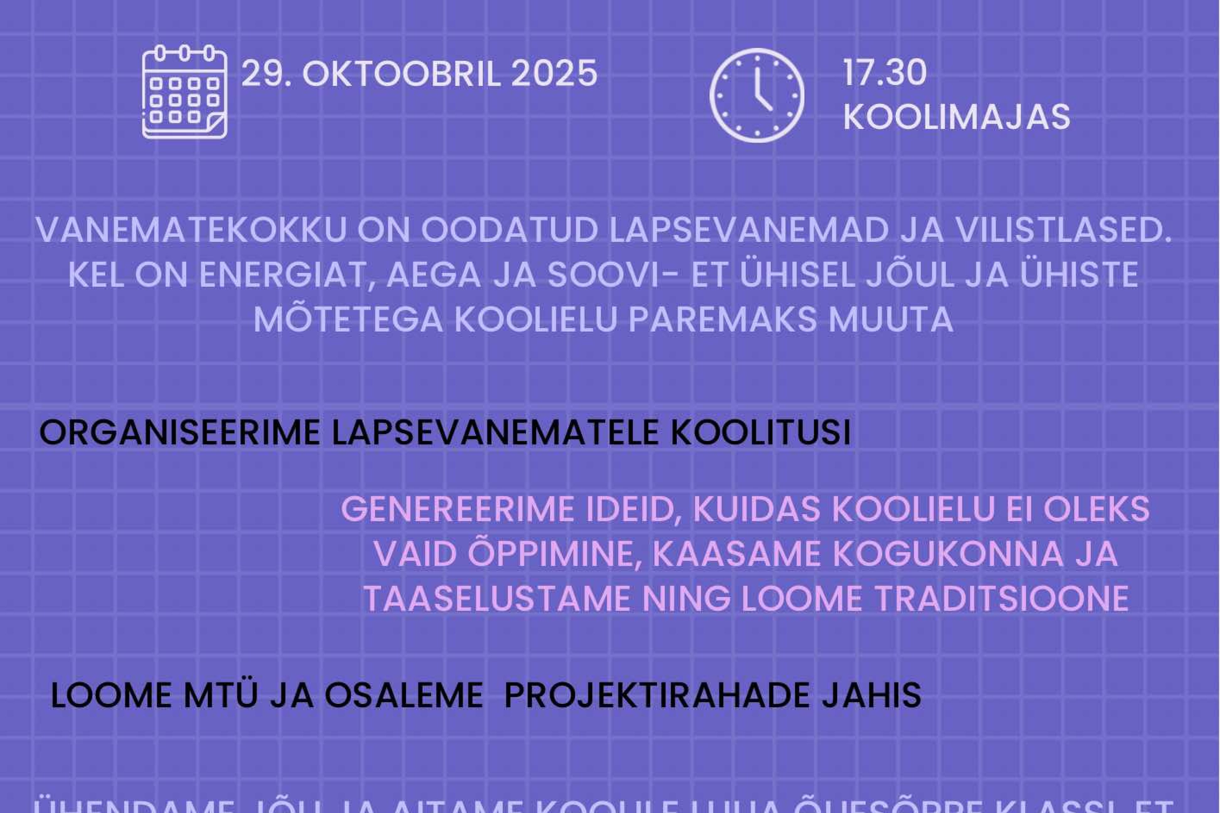Oodatud on kõik vanemad ja vilistlased, kel on energiat, ideid ja tahtmist panustada, et kool oleks lastele veel toredam ja parem koht.