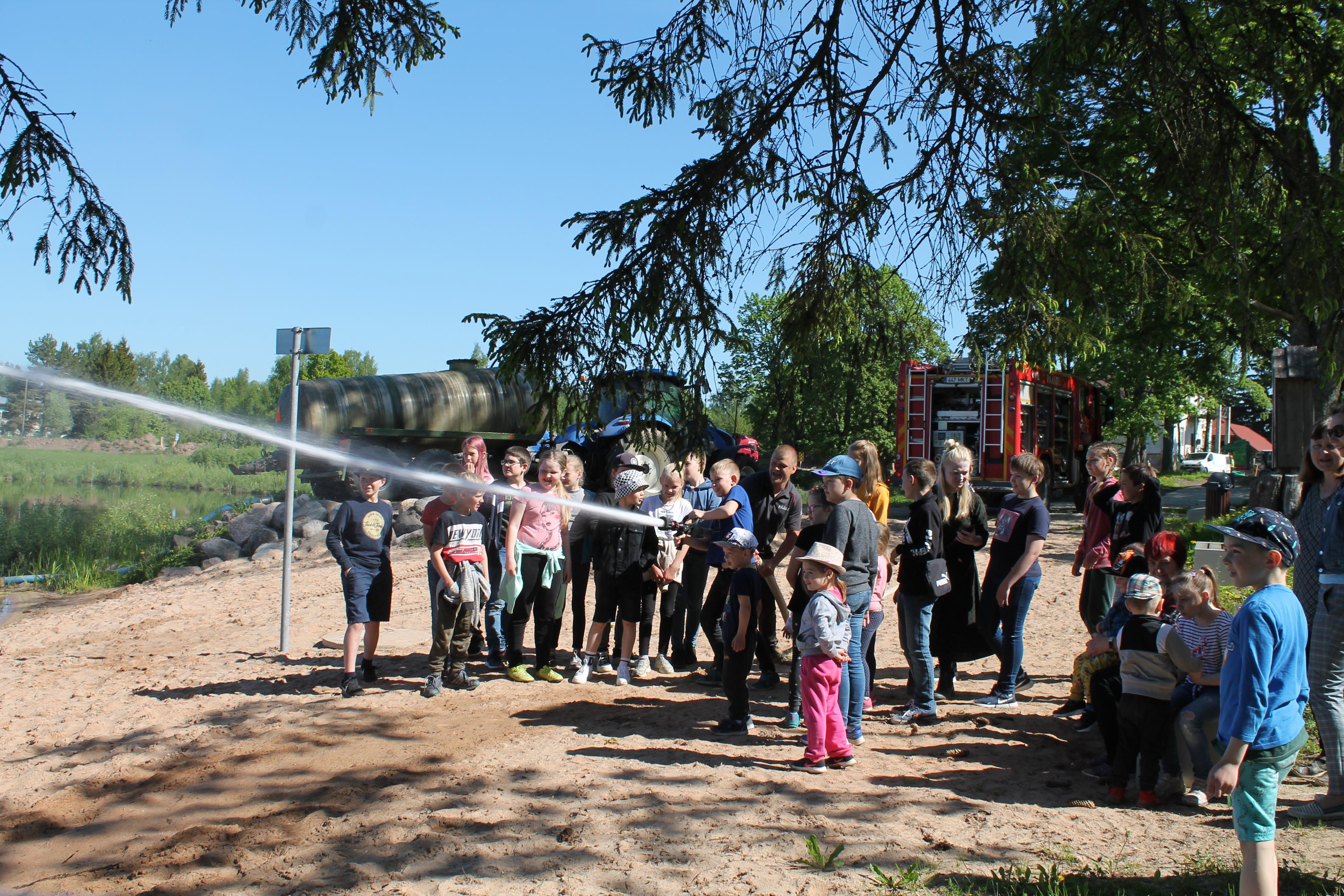 Lastega korrati üle tuleohtusreeglid, tutvustati päästemeeskonna tööd ja tutvuti päästeautoga. Viimane meeldis lastele kindlasti kõige rohkem, sest lisaks vaatamisele, kuulamisele ja kabiini ronimisele said lapsed oma käega päästeauto voolikust vett lasta.
